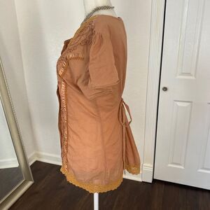 Orange Tan Vintage Boho Embroidered Babydoll Blouse Top M