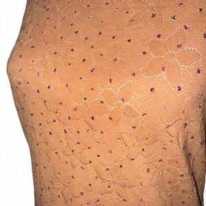 Vintage sleeveless top in a warm orangey-brown cinnamon caramel shade with floral lace and scattered glitter detailing that catches the light for subtle sparkle. Soft and slightly stretchy with delicate cutout floral patterns. Perfect for styling under a jacket for a cozy-meets-glam vibe. In great pre-loved condition with no noted flaws.