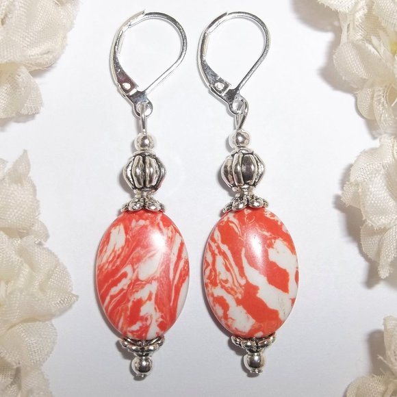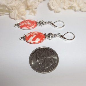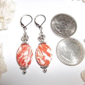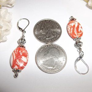 This funky earring set is brand new & handmade by me - wvluckygirl. Done with orange gem stone oval beads with white swirls. They have antiqued silver toned costume jewelry beads. The pair dangle & drop from 925 sterling silver lever backs for women's pierce ears. 2 1/8 inch tall & 1/2 inch wide. Each single earring weighs 2.8 grams. Would be stunning with a white shirt or dress. Very eye catching and unique. People are sure to give you lots of compliments when you wear them. Buy them now before someone else does!!