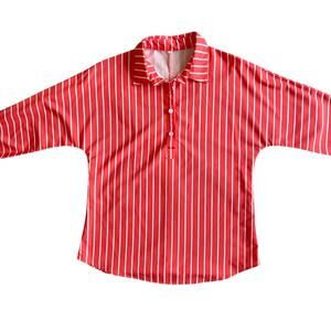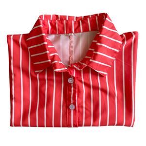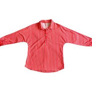 Add a pop of color to your wardrobe with this Women’s Orange & White Striped Half Button Down Shirt in size medium. Featuring a classic collared neckline and long sleeves, this stylish top offers a regular fit and crisp orange and white stripes for a polished yet casual look. Made from 100% polyester, it measures 20" across the chest and 26" in length. Like new and only worn once, this machine-washable shirt is perfect for work, weekends, or layering year-round. A versatile piece for any closet!