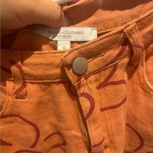These vibrant orange wide leg pants feature a playful floral pattern, offering a relaxed fit perfect for casual outings. Crafted from a comfortable material, they provide both style and ease for everyday wear.
