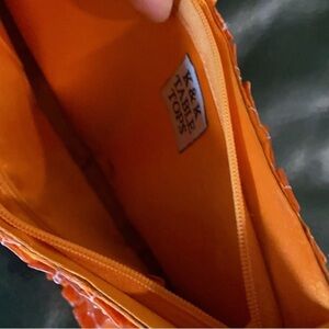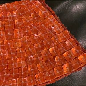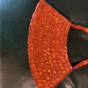 Stylish orange woven clutch perfect for any occasion. Add a pop of color to your outfit with this elegant accessory.