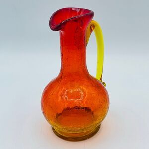 Orange Yellow Amber Crackle Glass Handled Small Pitcher Vase Partial Glow MCM