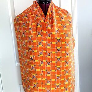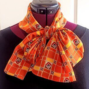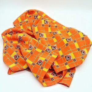 Pure silk oblong scarf in a bright sunny orange and yellow geometric print.