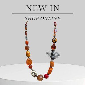 this necklace features vibrant orange and amber beads elegantly strung together, offering a warm and iTnviting color palette. The detailed bee pendant adds a touch of nature-inspired charm and symbolizes diligence and community. Crafted to complement both casual and refined outfits, this piece balances bold hues with delicate design, enhancing your look with expert precision.