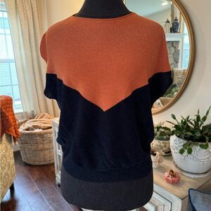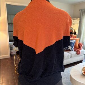 Stylish crew neck sweater. Features a bold orange and black design. Perfect for casual wear.