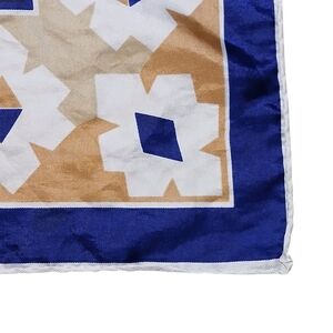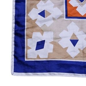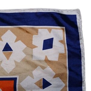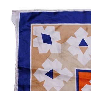 This vibrant scarf features a striking geometric pattern with a bold orange center and a navy blue border. Lightweight and square-shaped, it's perfect for adding a touch of color and style to any outfit. The intricate design showcases traditional folk art motifs, making it a unique accessory for any occasion.