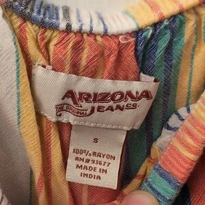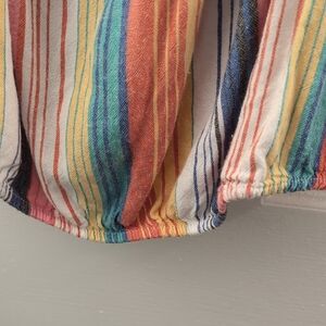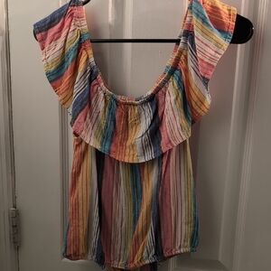 This sleeveless blouse features a relaxed fit with ruffled details, perfect for a casual day out. The vibrant orange and blue colors add a lively touch to your wardrobe. Made from lightweight fabric, it ensures comfort and style in warm weather.