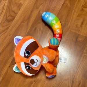 This plush raccoon toy features a vibrant orange body and light blue inner ears, making it a standout addition to any toy collection. Its cartoonish design with large round eyes and a soft, huggable texture ensures endless cuddles and imaginative play. The stylized proportions, including a large head and a rainbow-colored tail, add to its unique charm.
