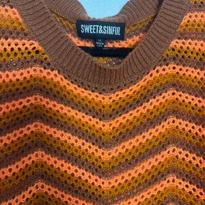 This sweater features a striking chevron pattern in vibrant orange and brown hues, perfect for adding a pop of color to your wardrobe. The crew neck design and relaxed fit make it an ideal choice for casual outings. Made from a soft, plush material, it promises comfort and warmth throughout the day. The dynamic zigzag stripes create an eye-catching visual appeal. Measurements laying flat are approximately Chest- 24 Length- 24