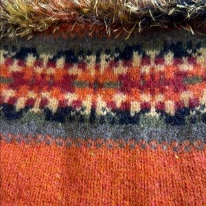 This vibrant bag features a striking orange body complemented by a decorative fringe band in shades of brown and orange. Its compact design and sturdy handles make it a perfect accessory for any occasion, adding a pop of color and texture to your ensemble.