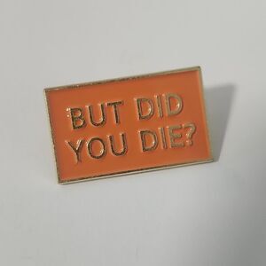 Rectangular orange enamel pin with gold lettering: 'BUT DID YOU DIE?' Inventory Location Box 63