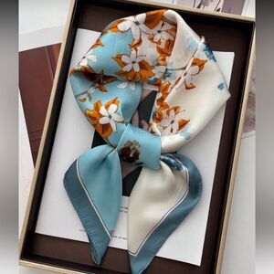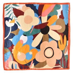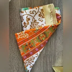 Stylish scarf with intricate orange and gold patterns. Perfect for adding a touch of elegance.