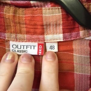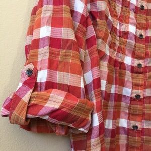 Comfortable, loose fitting, plaid shirt. Button-down and roll tab sleeves so can be word long sleeve or 3/4 sleeve. Pintucks on front. Worn but good condition, no rips or stains. German size 48 which converts to 18 US.
