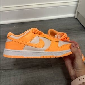 Stylish orange and white sneakers with a sleek design. Nike dunk lows. Used but in good condition. no box