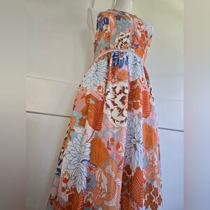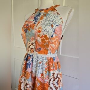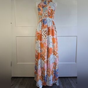 This elegant maxi dress showcases a vibrant orange floral design against a crisp white backdrop, perfect for resort wear. The sleeveless halter neckline adds a touch of sophistication, while the flowing silhouette ensures comfort in warm weather. Ideal for making a statement at any sunny occasion.