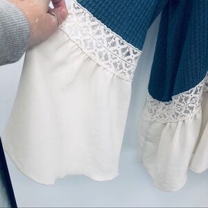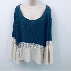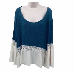 Orange creek women’s oversized top large blue thermal white double layer Nylon material Bell sleeves ruffle bottom with lace trim in like new condition see photos for more details See photos for more details