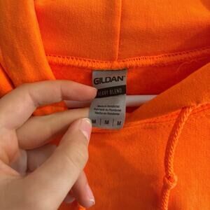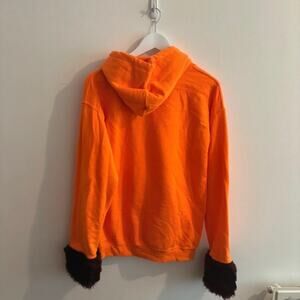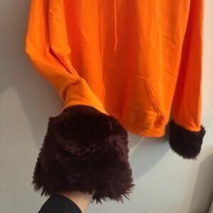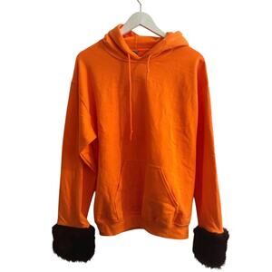 Bright hunters orange hoodie with burgundy faux fur cuffs. Super cute and cozy. Size medium. Fair condition (a couple spots shown in photos). I upcycled this myself to put the maroon cuffs on :)
