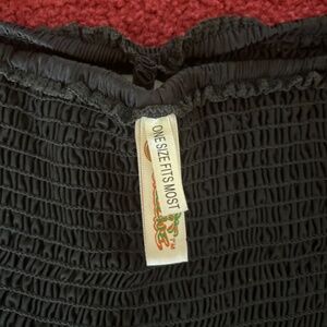 This fun dress has a complementary handkerchief style Bottom and tube stretch on top. This exciting dress is One size fits most. It has stretch and spandex polyester materials with gold lame brush strokes throughout