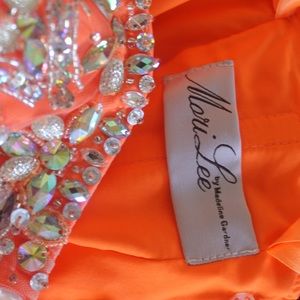 This bright orange gown is a show stopper. It is a mermaid shape with a tulle bottom and studded with beautiful embellishments. It has a corset back and modesty panel comes with it. Worn for a pageant, only worn once.