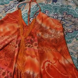 Orange top with flower print and beaded necklace