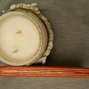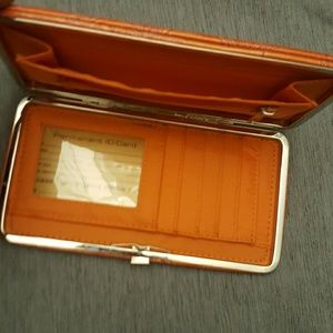 Orange with textured pattern, hindge and snap wallet. This item is new and has never been used but does not have the tags. Excellent condition.