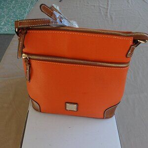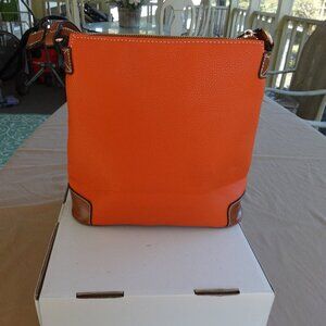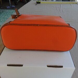 Orange with brown trim faux leather crossbody purse, gold tone hardware, adjustable strap still in