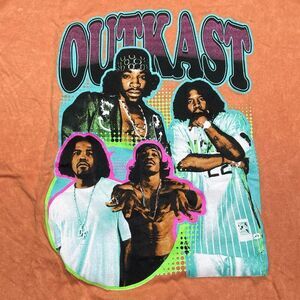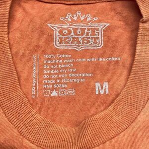 Features and details: minimal stretch, orange acid wash all over, crew neck, Outkast graphic on front only