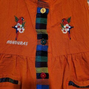 Bright orange kids dress featuring charming embroidered details. Perfect for playful days. The Orange Girls Embroidered Honduras Dress is a stylish and vibrant option for young girls looking for a casual yet eye-catching outfit. Made from comfortable cotton material, this knee-length dress features a sleeveless design with strappy sleeves and a round neckline with a button closure. The dress is adorned with embroidered accents, adding a touch of Mexican flair to the overall outfit. Perfect for the summer and spring seasons, this dress in size 4 is sure to stand out with its bold orange color and mini style.