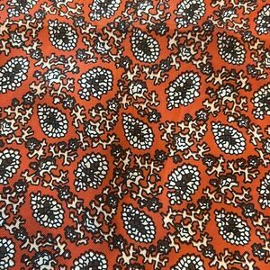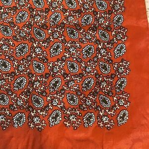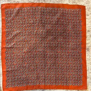 Vibrant orange scarf with intricate patterns. Perfect for adding a pop of color. Approximately 23 x 23”.