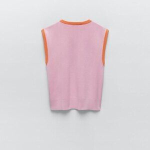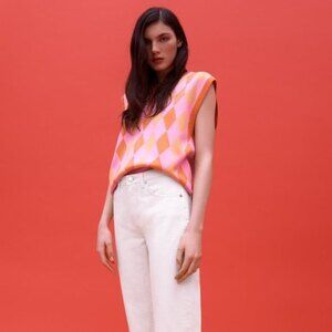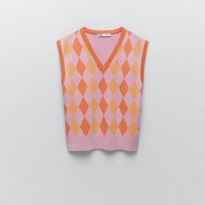 Orange/Pink Zara Argyle Print V-Neck Sleeveless Sweater Vest (NWT)