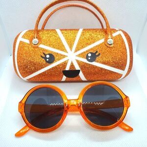 Orange sunglasses with orange sparkly smiling orange design case with handles.