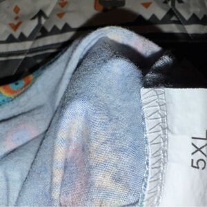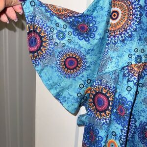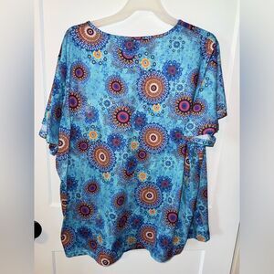This relaxed blouse features a vibrant pattern of circular designs in orange and blue, creating a striking contrast. The short sleeves and flowy fabric make it perfect for a casual, breezy look. Ideal for summer outings or resort wear, this top adds a pop of color to any wardrobe.