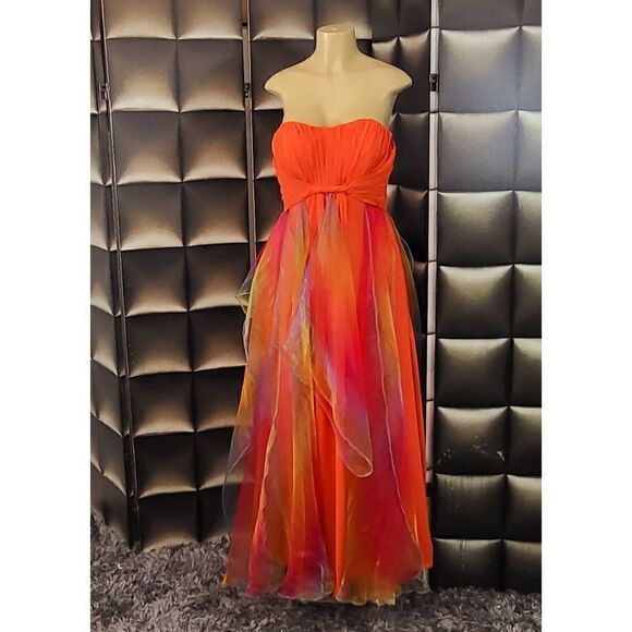 Multicolor polyester and chiffon strapless full length aline dress . Corset lace up back.
