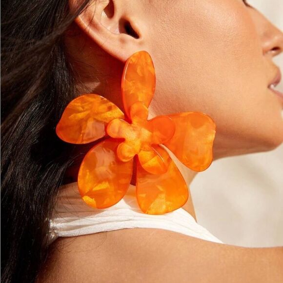 Oversized orange acrylic flower dangle stud earrings in silver tone hardware