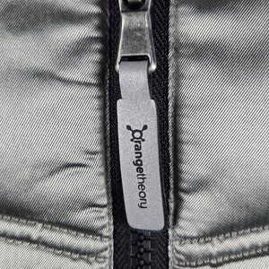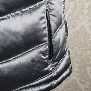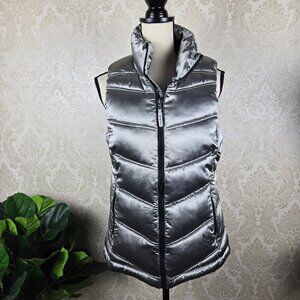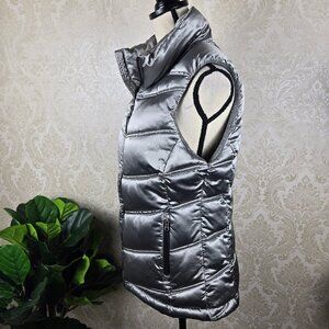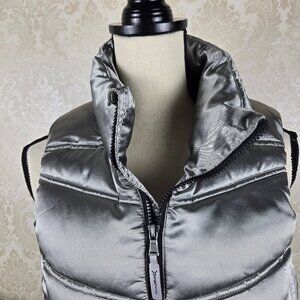 Silver puffer vest with black accents at zipper front and zip pockets. Quilting is on a diagonal towards the zipper on the front. Horizontal quilting lines on the back. Stand up collar. Logo near front pocket and on the the main zipper pull.