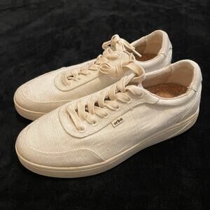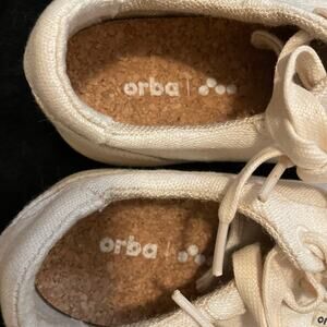 Off white biodegradable low top Ghost Sneakers by Orba. "Choose comfort and style that doesn’t compromise with the Orba Ghost plant-based sneaker. An award-winning design pairs with all-day comfort in a new take on an urban silhouette. Breathable, light and in step with nature." Very good pre-owned condition - some light marks on canvas and on rubber trim (see all pics). A Euro size 41, which equates to about a US size 10 according to size charts on the designer's website.