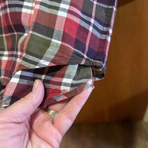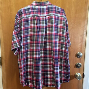 Preowned the shirt has been dry cleaned. Button down collar. one pocket short sleeve. Round bottom extended tail. 27 1/2 inches pit to pit 34 inches long. 100% cotton.