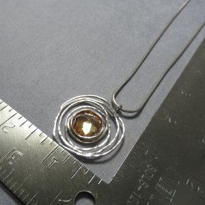 The orbital citrine design measures 32 mm in diameter and the chain is 18 inches long. Both pieces are marked .925 to indicate sterling silver purity. Together, the pendant and chain weigh 14 grams.
