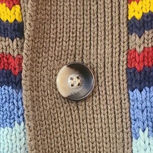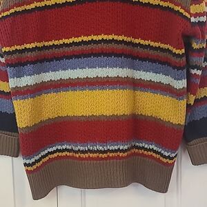 Bold multicolor stripes in red, yellow, blue & brown. Button front, shawl collar, long sleeve. Retro-inspired layering piece.