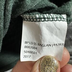 Small Ladies Cut Heathered Green crew neck by Fanatics. White raglan contrast sleeve with cuff hem & white contrast basted collar hem. Distressed yellow print EUGENE banner spelled out and a small UofO Puddles duck cartoon on front.