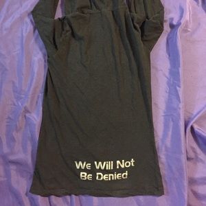 Gently used, great condition. Black with silver. On back it says at the bottom "we will not be denied". Size medium in women's