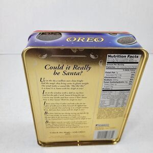 Festive and colorful Oreo tin depicting Santa and his reindeer flying through the sky with a bag full of toys!