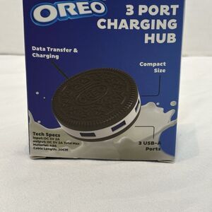 The Oreo Cookie 3 Port Charging Hub is a unique and fun charging dock designed for cell phones and accessories. With three ports for charging, it allows for multiple devices to be charged simultaneously. The hub features an Oreo theme, adding a playful touch to the charging experience. This charging hub is a convenient and stylish accessory for keeping all your devices powered up in one place.