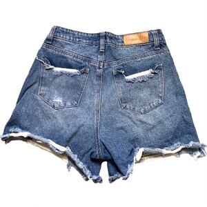 Organic Blue Distressed Raw Hem Denim Mom Shorts, Size 2
