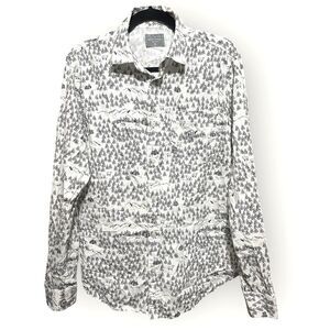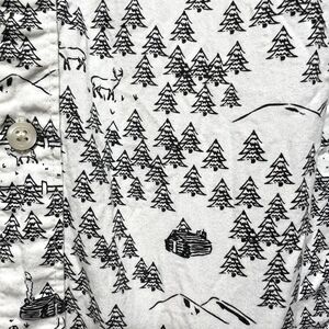 Stylish men's shirt featuring a classic black pattern on a white background.soft organic cotton, chest 38/40 and length 31”, long sleeve, button up, mountain scenery, sustainable, Threads 4 thought, Madison, size medium, excellent condition