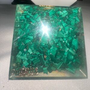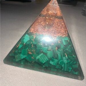 Stunning pyramid with a malachite base and a Melatron cube symbol and a copper coil. Perfect for home decor.Organite is a self sustaining energy center . Orgone is another word for life source energy . Made of Malachite stone , copper , metal and resin . Tiny microscopic chip on apex of pyramid . Not visible to naked eye .
