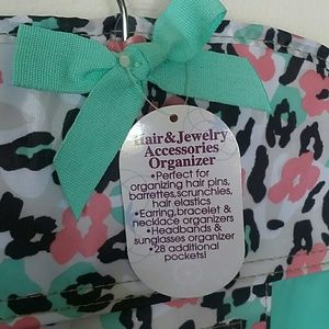 Hair and jewelry organizer. One side has mirror and other clip holders. Other side has 16 small pockets, 4 medium pockets, and one large pocket. Never used. Still will tags. Color is teal with pink, black, teal, and beige camouflage.
