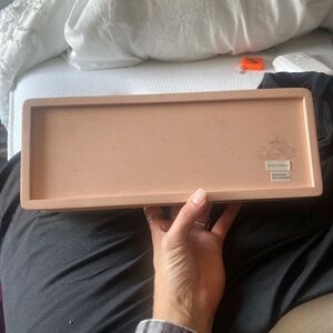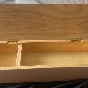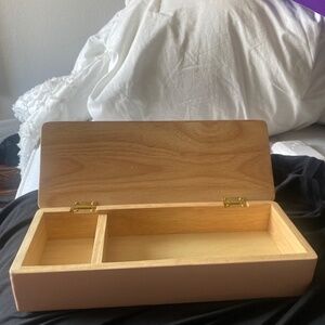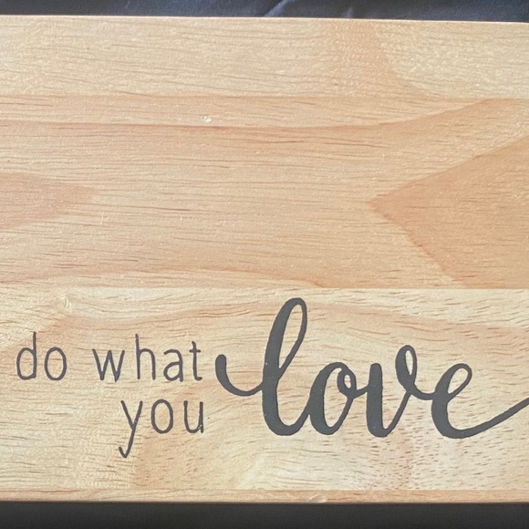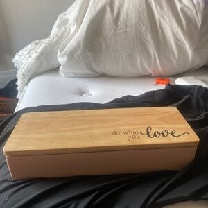 Wood box. Light pink with natural wood lid. Says, “do what you love” on top of the lid.