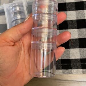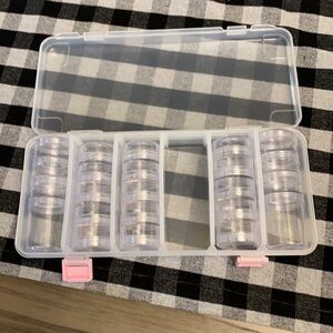 Plastic container with lots of small storage and individual twist off containers 5 of them inside. Great do keepsakes or jewelry coins ….